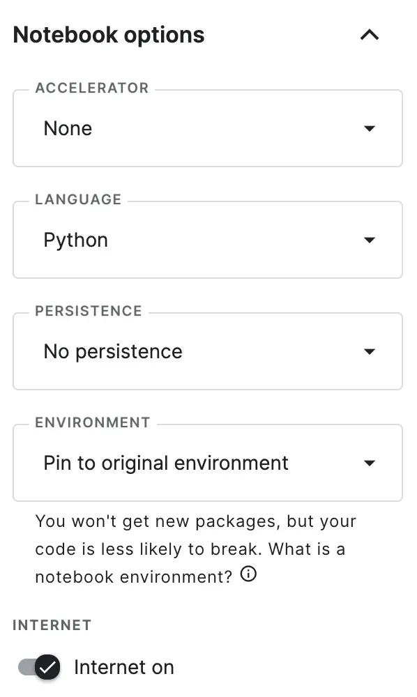 There are also some options to choose from, including adding a GPU or other accelerators, selecting between Python and R, enabling persistence so that data isn’t lost across sessions, as well as pinning an environment to maintain reproducibility. These are several features that aren’t available in Colab nor in Jupyter.