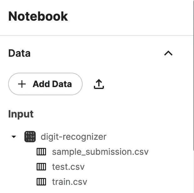 After the dataset is added, it will appear in a folder in the path `kaggle/input`. For the Digit Recognizer example, it was added to `kaggle/input/digit-recognizer`.