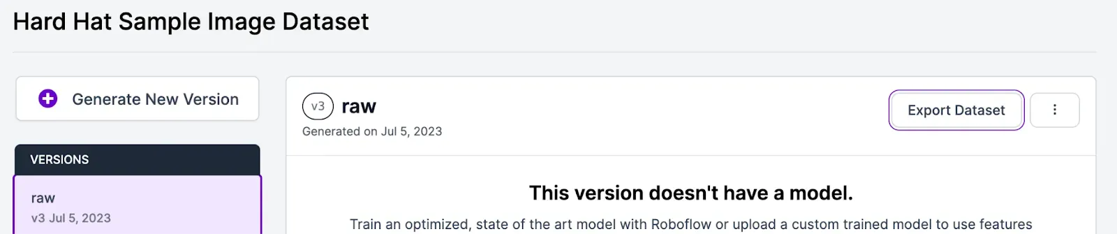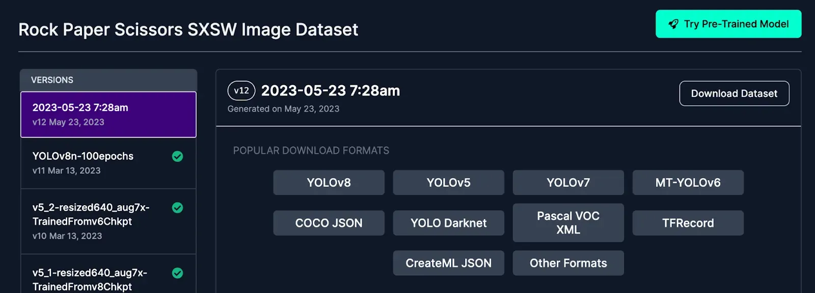 Once you’ve found a dataset you’d like to upload, select a version from the project and download the dataset in your preferred format. A version is a point-in-time snapshot of your dataset that keeps track of the images, annotations, preprocessing, and augmentations of the dataset at a certain time, allowing you to consistently reference and reproduce the exact dataset.