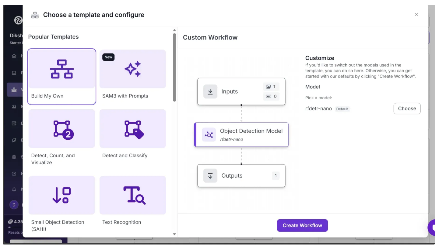 To get started, create a free Roboflow account and log in. Then, create a workspace, click “Workflows” in the left sidebar, and click the “Create Workflow” button to get started.
