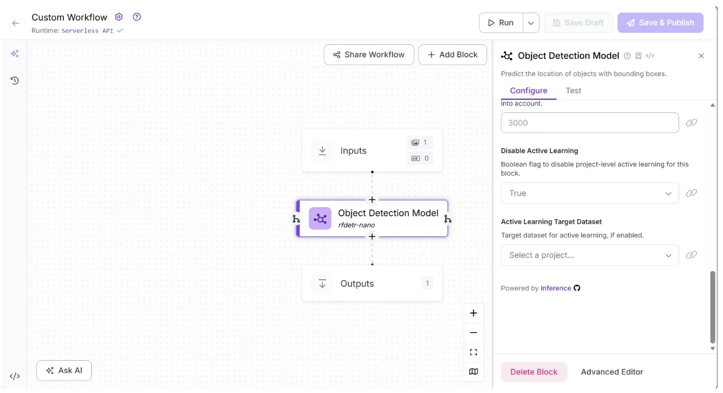 Then you’ll be taken to a blank workflow editor, ready to build your AI-powered workflow, where you’ll see three workflow blocks: Inputs, Outputs, and an Object Detection Model.