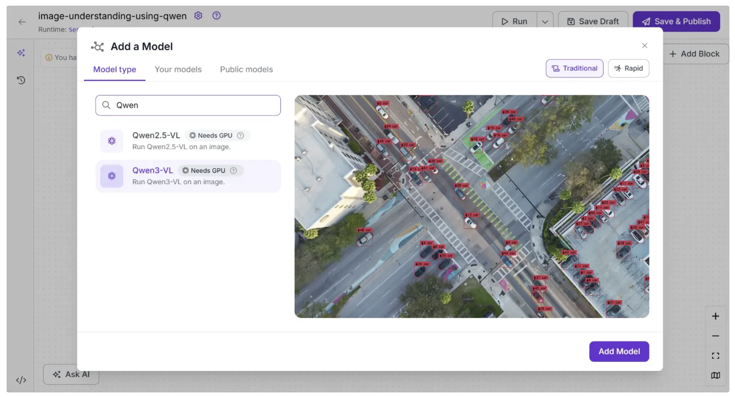 Next, add a Qwen3-VL block to the workflow. This block enables the workflow to run the Qwen3-VL model without requiring you to set up or manage the model yourself. To add it, click “Add a Model” in the workflow editor, search for “Qwen”, select “Qwen3-VL”, and then click “Add Model”, as shown below: