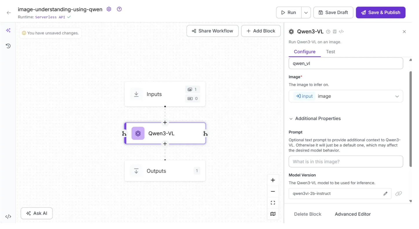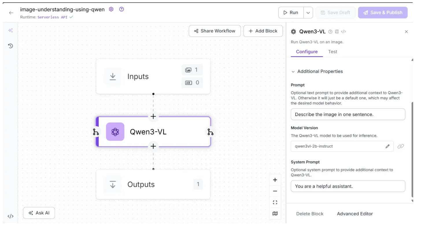 You can also configure the ‘Prompt’ and ‘System prompt’ within the Qwen3-VL block to guide the model’s outputs by selecting the Qwen3-VL block, opening its configuration tab, and then updating it, as shown below:
