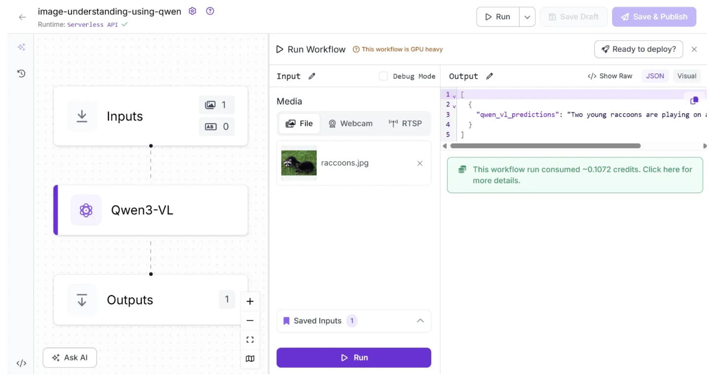 Note: The device hosting the Roboflow Inference server must have a GPU available; otherwise, a runtime error will occur when running the Qwen3-VL workflow.