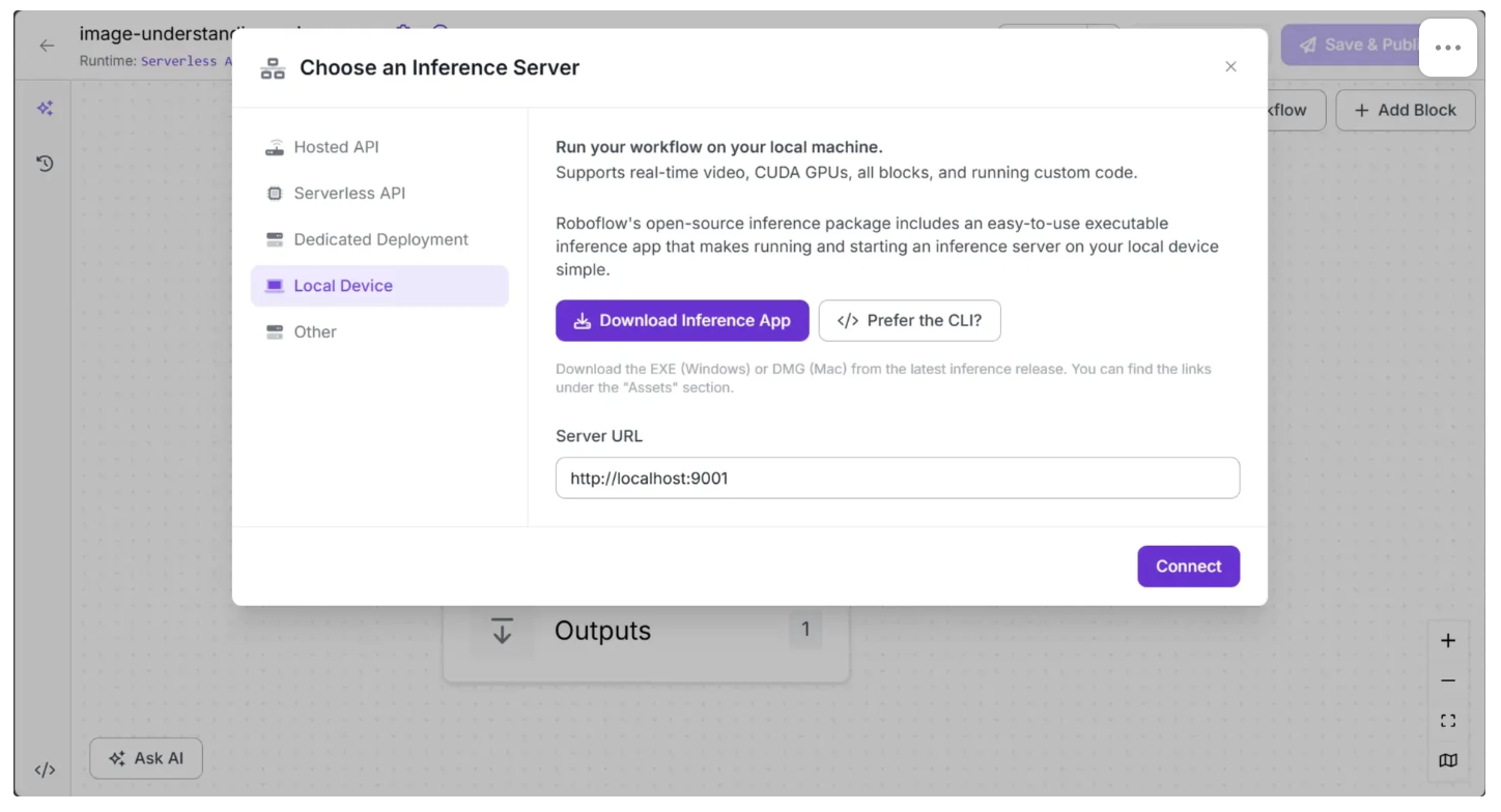 To self-host your own Roboflow Inference server and connect your workflow to it, click the text that follows ”Runtime:” in the top-left corner, then select ”Local Device” as shown below: