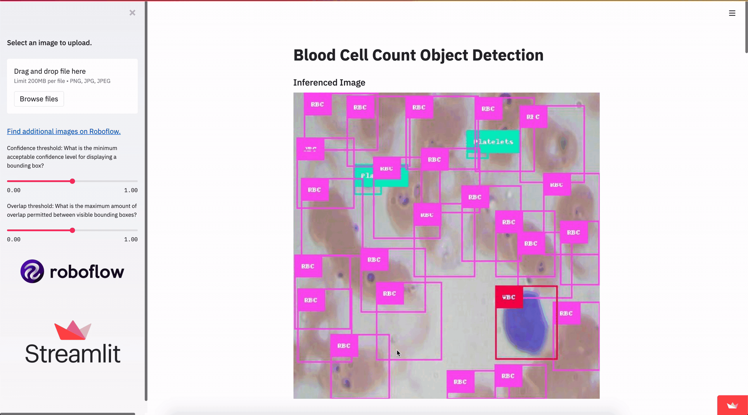 We’ll build an object detection model that detects platelets, white blood cells, and red blood cells. Then, the app we develop together will allow you to make predictions with your object detection model, visualize those predictions at a given confidence level, and edit those predictions based on your preferred confidence level with immediate visual feedback.