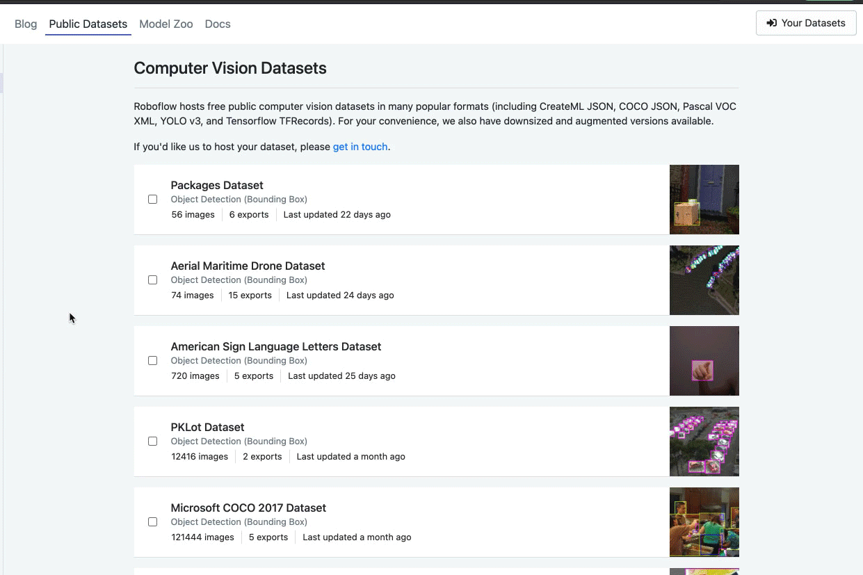 Once you have an account, go to our computer vision datasets page. We’ve made over 30 datasets of different types public and keep adding more.