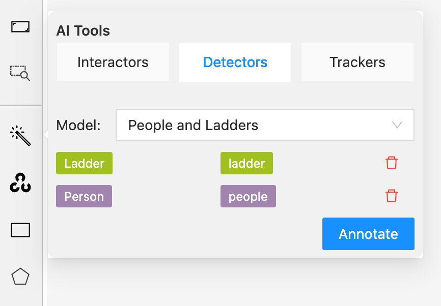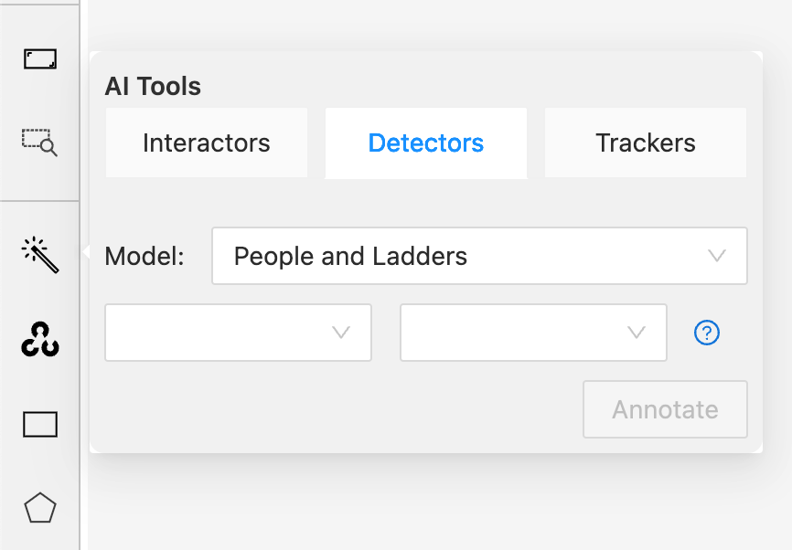 In the CVAT annotation interface, hover over the magic wand in the sidebar. Then, click “Detectors”. This will let you select which model you want to use to help you annotate images. Select the model you added to CVAT in the last step: