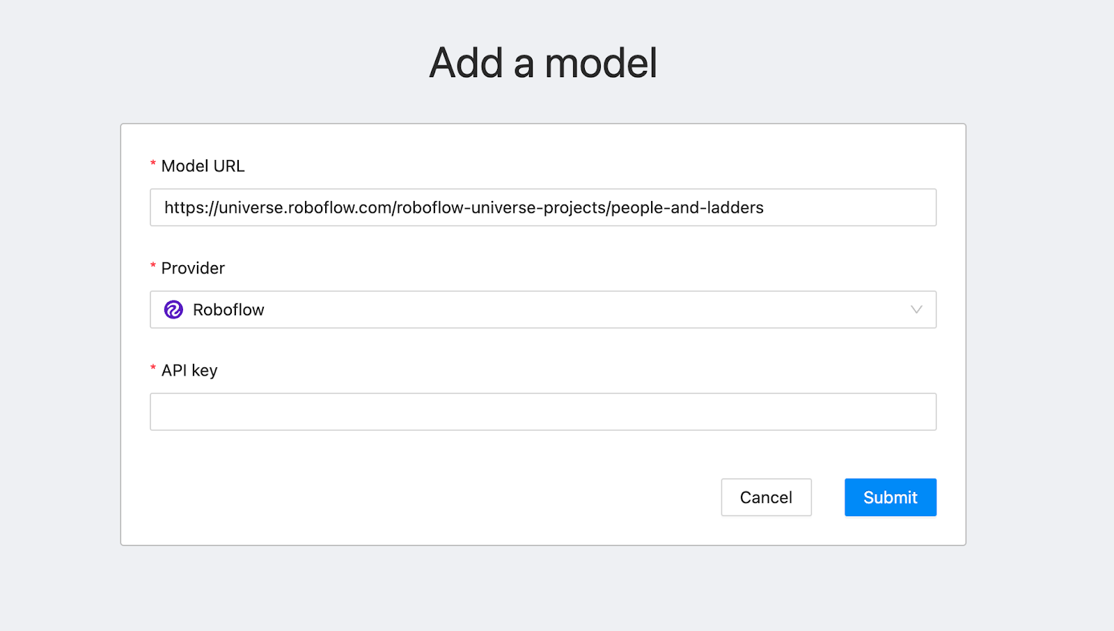 CVAT will automatically say the provider is “Roboflow”. You will need your API key to use the model. To retrieve this key, scroll down to the section with the heading “Infer on Local and Hosted Images” and copy the API key in the Python code snippet on the Universe page you are viewing. Copy the text after “api_key” and paste it into CVAT, then click “Submit”.