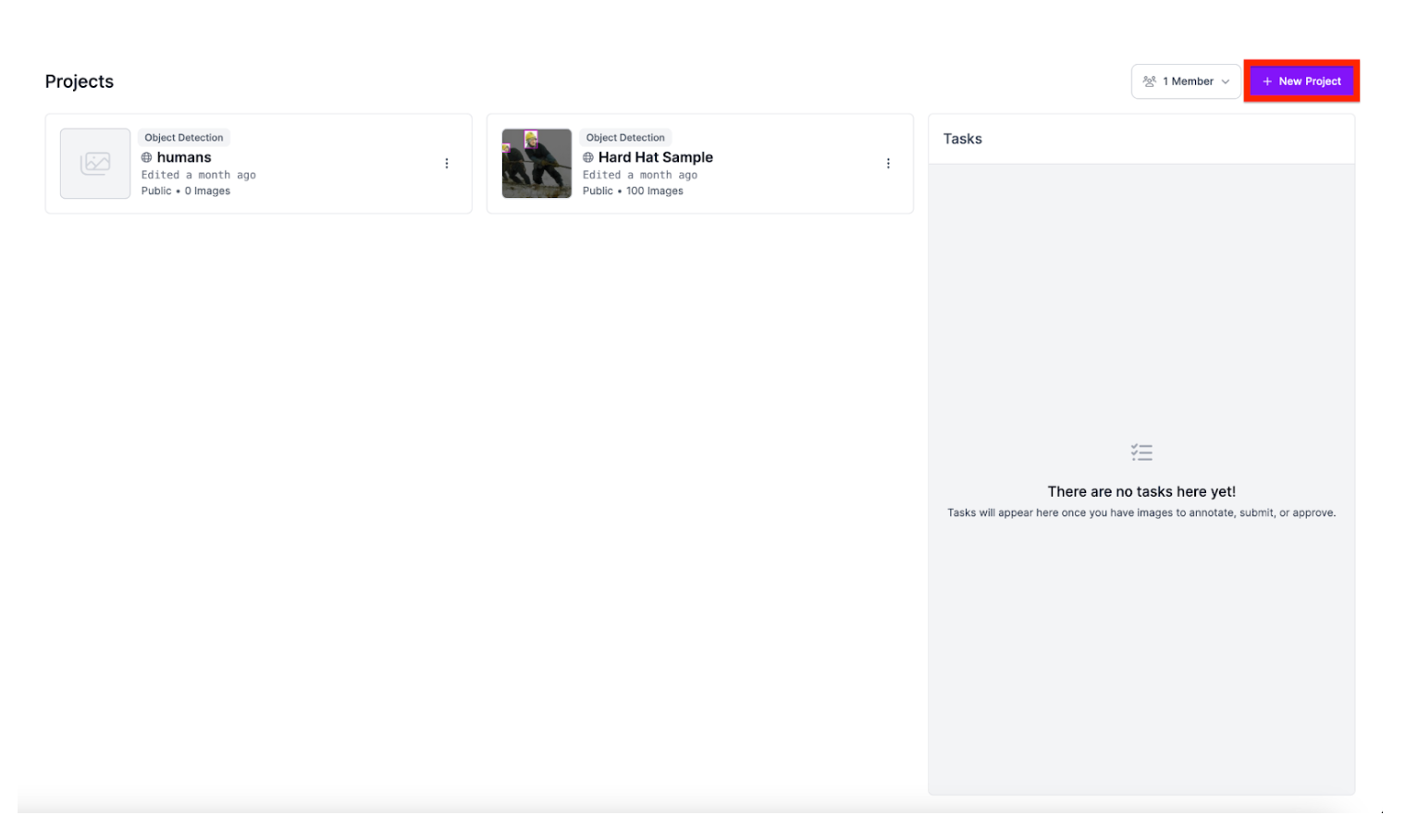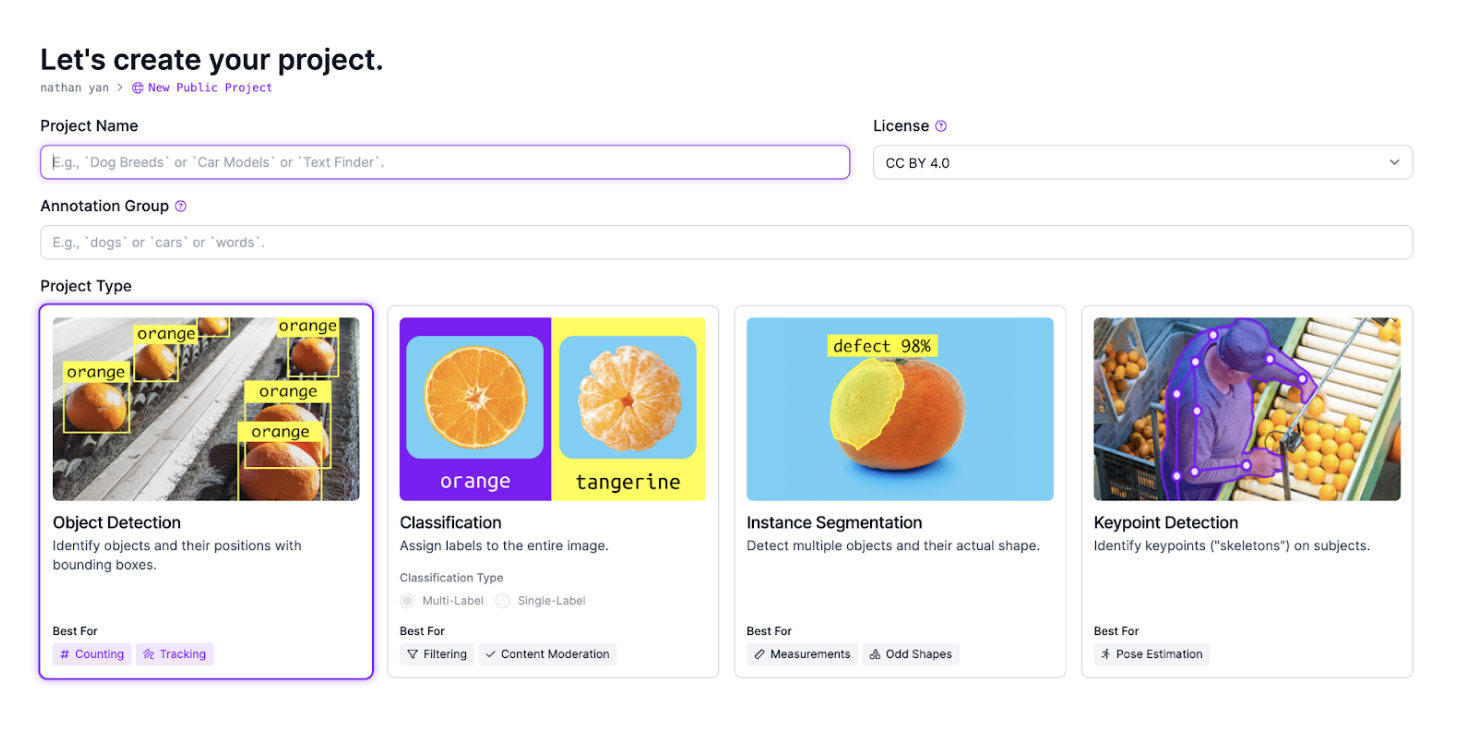 Next, pick a project type. Depending on your data and task, your project type may be different. Because the example dataset wants to detect the position and place of license plates, we will use an object detection project.