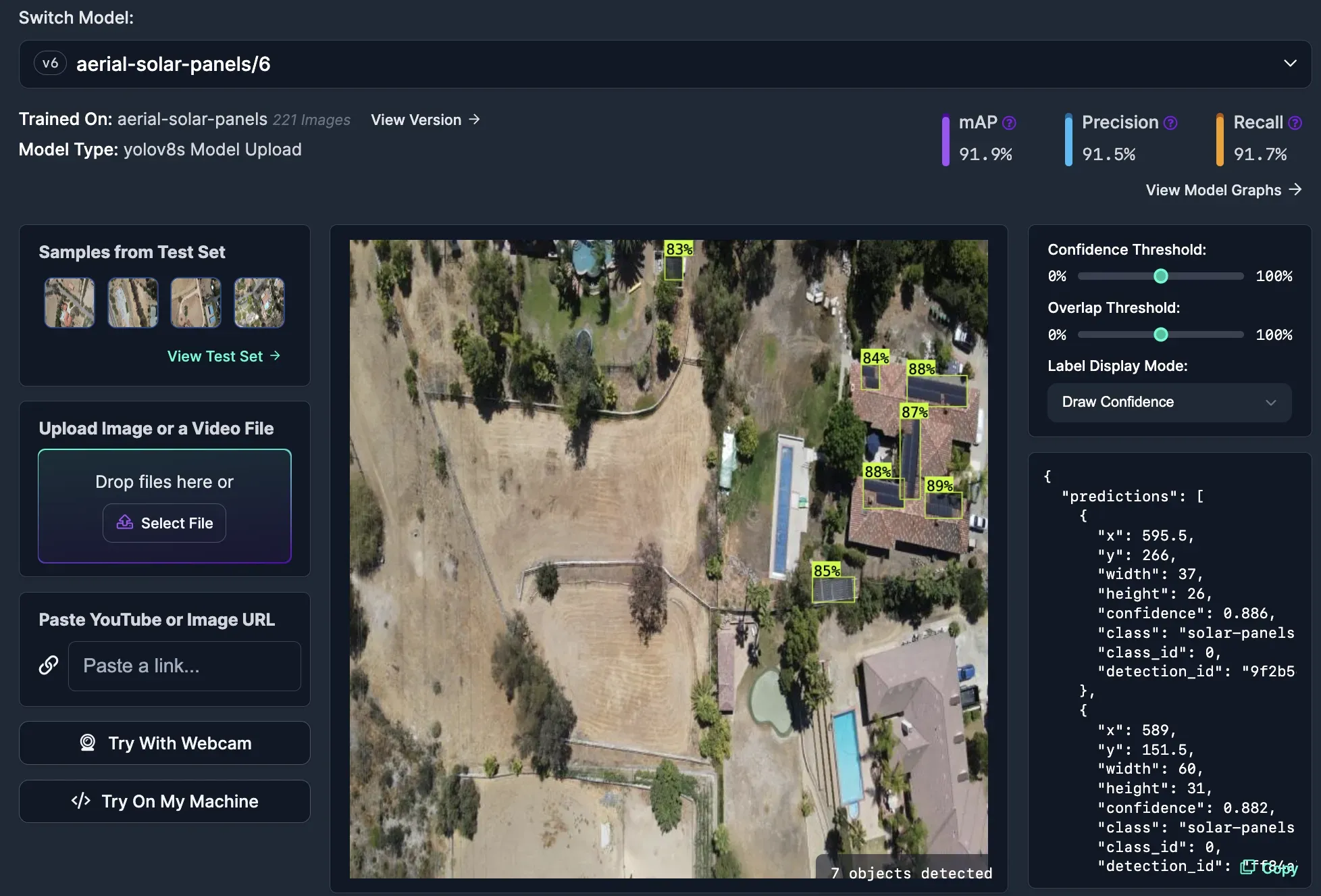In this guide, we walked through how to identify solar panels in aerial imagery with computer vision. We used a pre-trained model to identify solar panels then deployed that model using the hosted Roboflow API. The model could also be deployed on your own hardware using Roboflow Inference. We visualized predictions from our model. Finally, we discussed ways that you can improve or add additional functionality to a solar panel detection system.