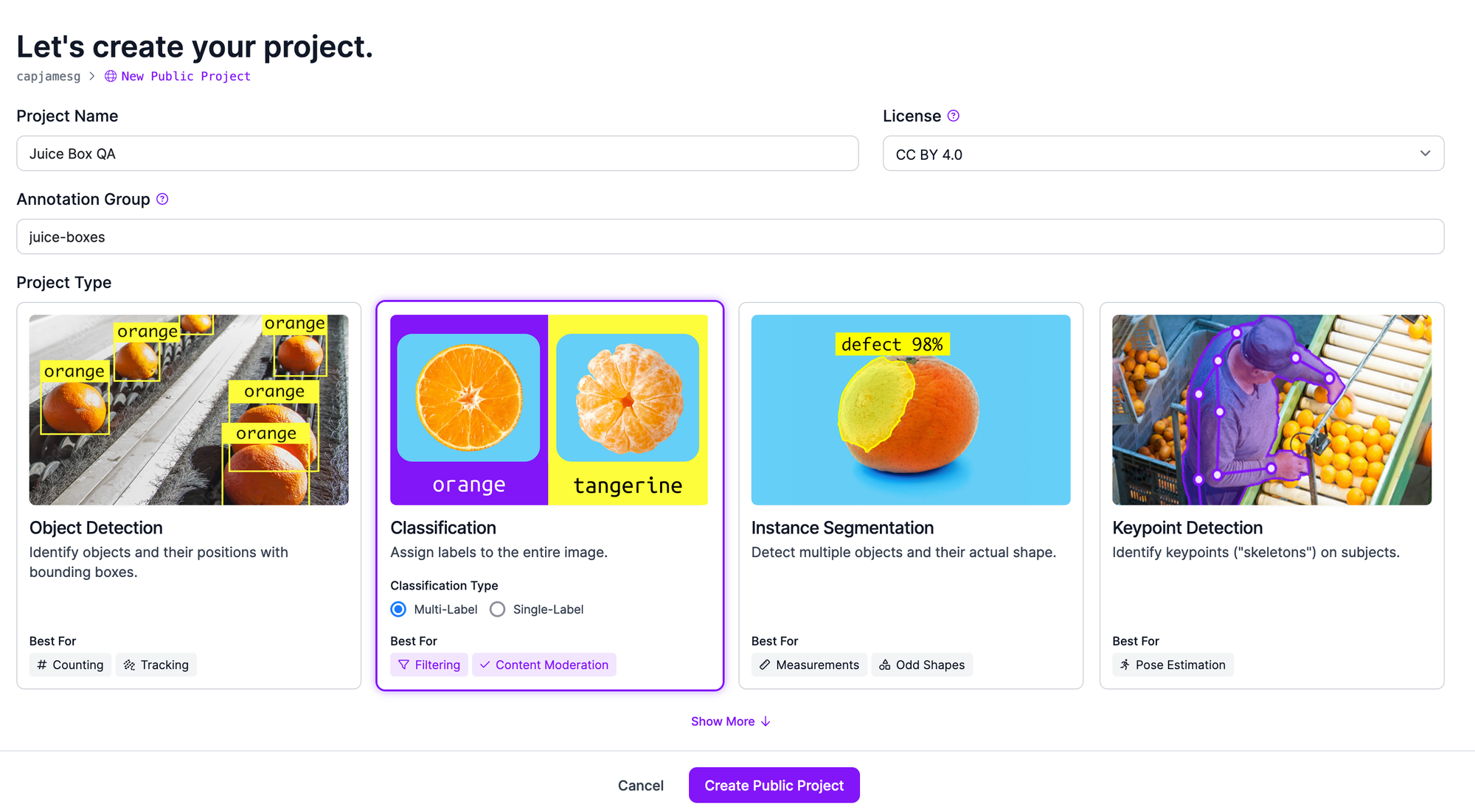 On this page, set a name for your project and choose “Classification” as the project type. Then, click “Create Project” to create your project.