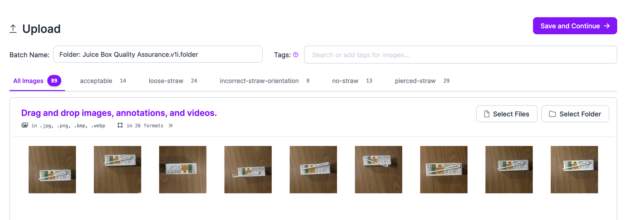 Once you have uploaded your images or annotations and images, click “Save and Continue” to add the data to your project.