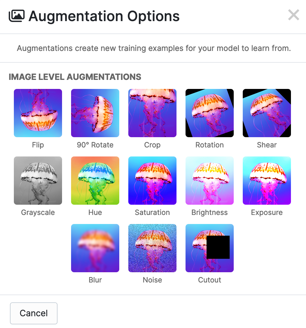 When you click on an augmentation, you will be able to see a preview of what it will do to an example image in your dataset. You can also configure the augmentation parameters.