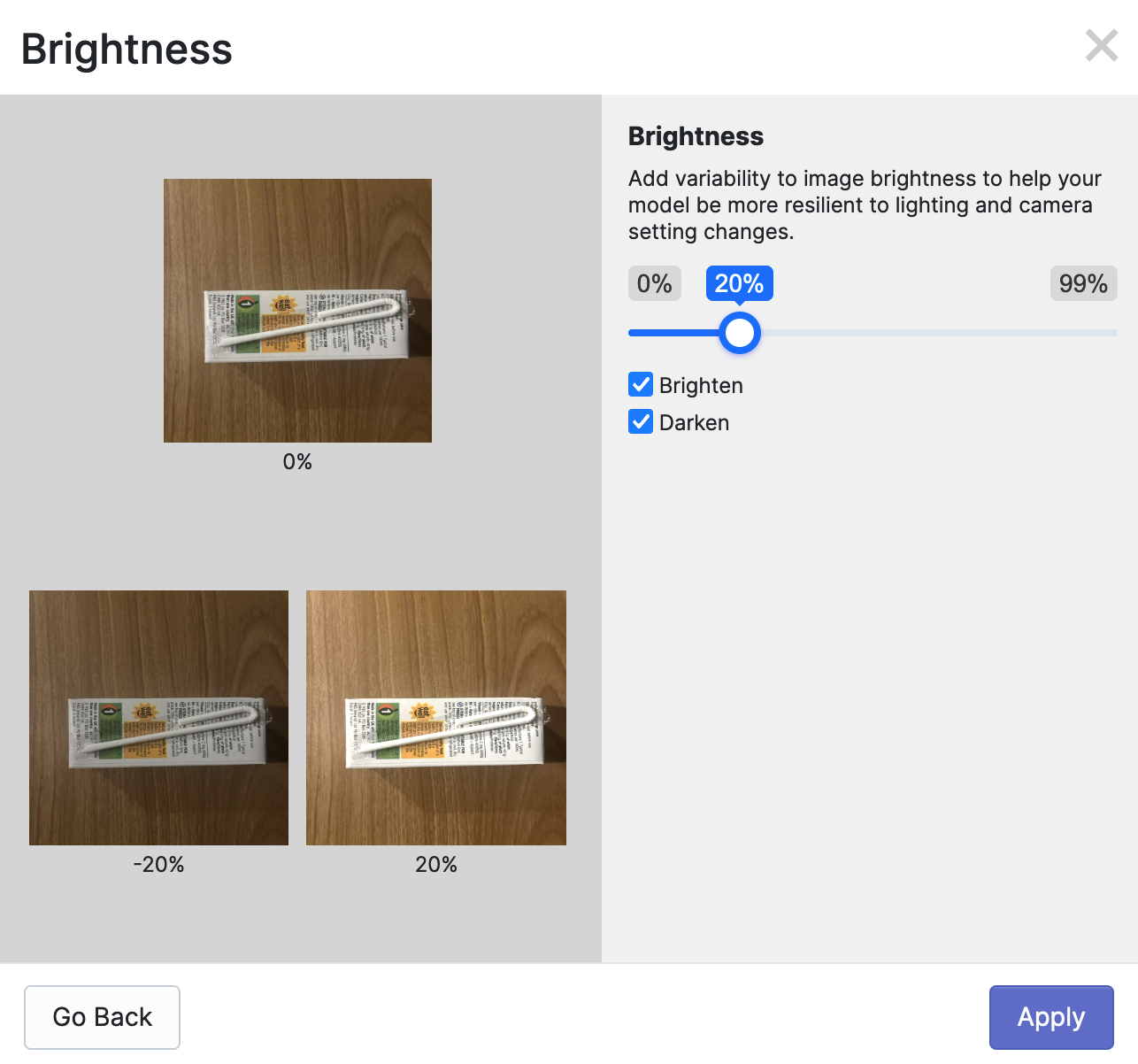 For example, if you apply a brightness augmentation, you can customize the range within which the brightness will be changed, and whether darker, lighter, or darker and lighter examples should be added. These parameters vary for each augmentation.