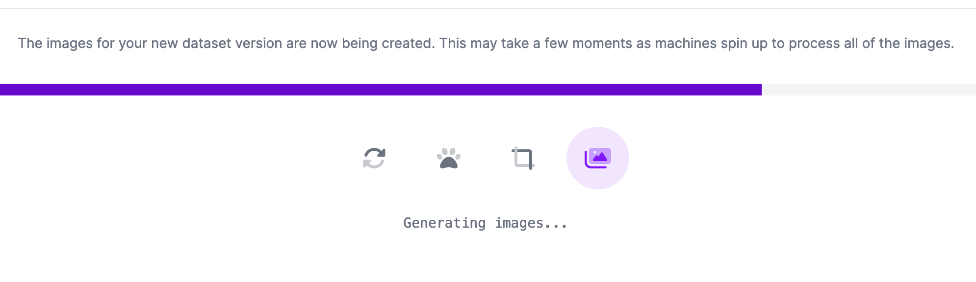 Once you have selected a maximum version size, click “Create” at the bottom of the page to create your dataset. The dataset creation process may take a few minutes. You will see a loading screen while your dataset is generated with augmented images.