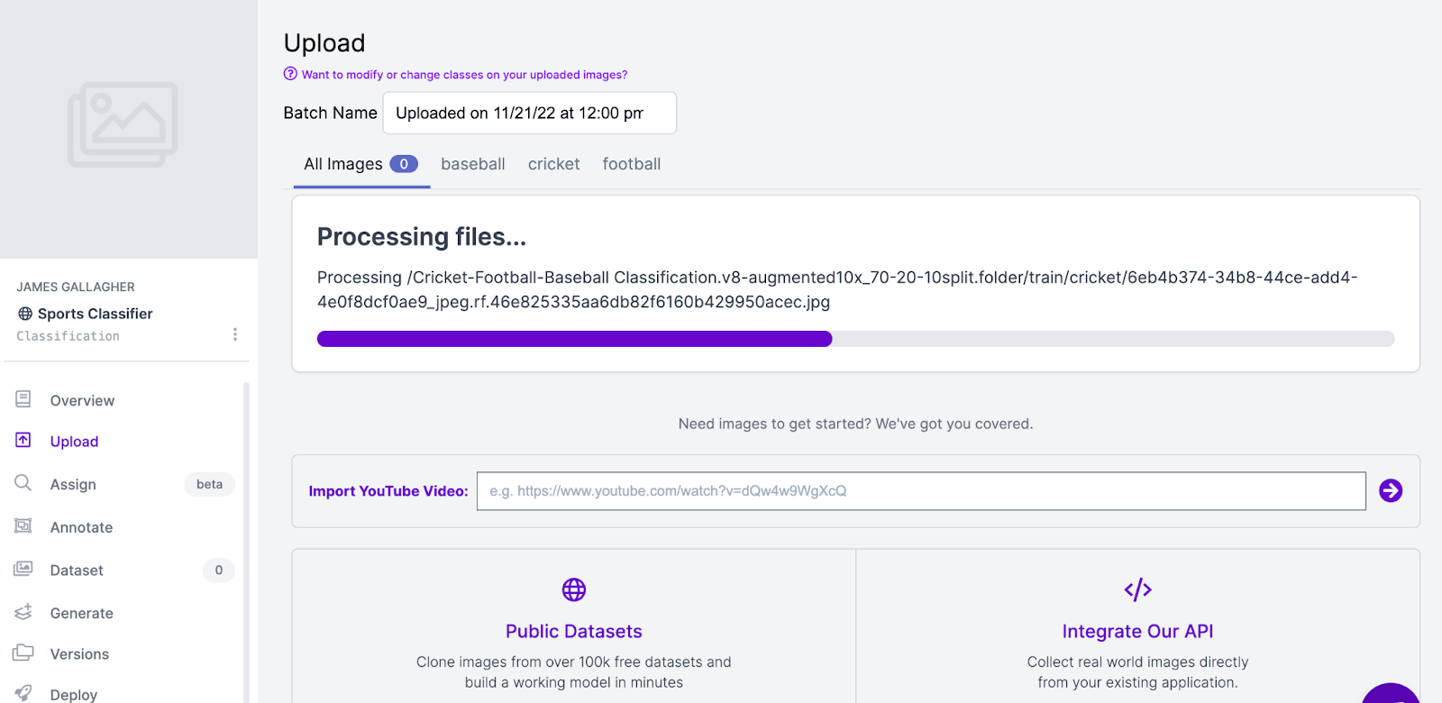 For our example, let’s create a project that classifies sports from an image. Specifically, we want to find a label that describes whether an image contains a game of cricket, baseball, or football. In business, this could be used to build a database that aids in searching images and videos. If the sport in an image is in our list of sports we can identify, we should be given a classification; otherwise, we should get no result. Let’s call our project “Sports Classifier”.
