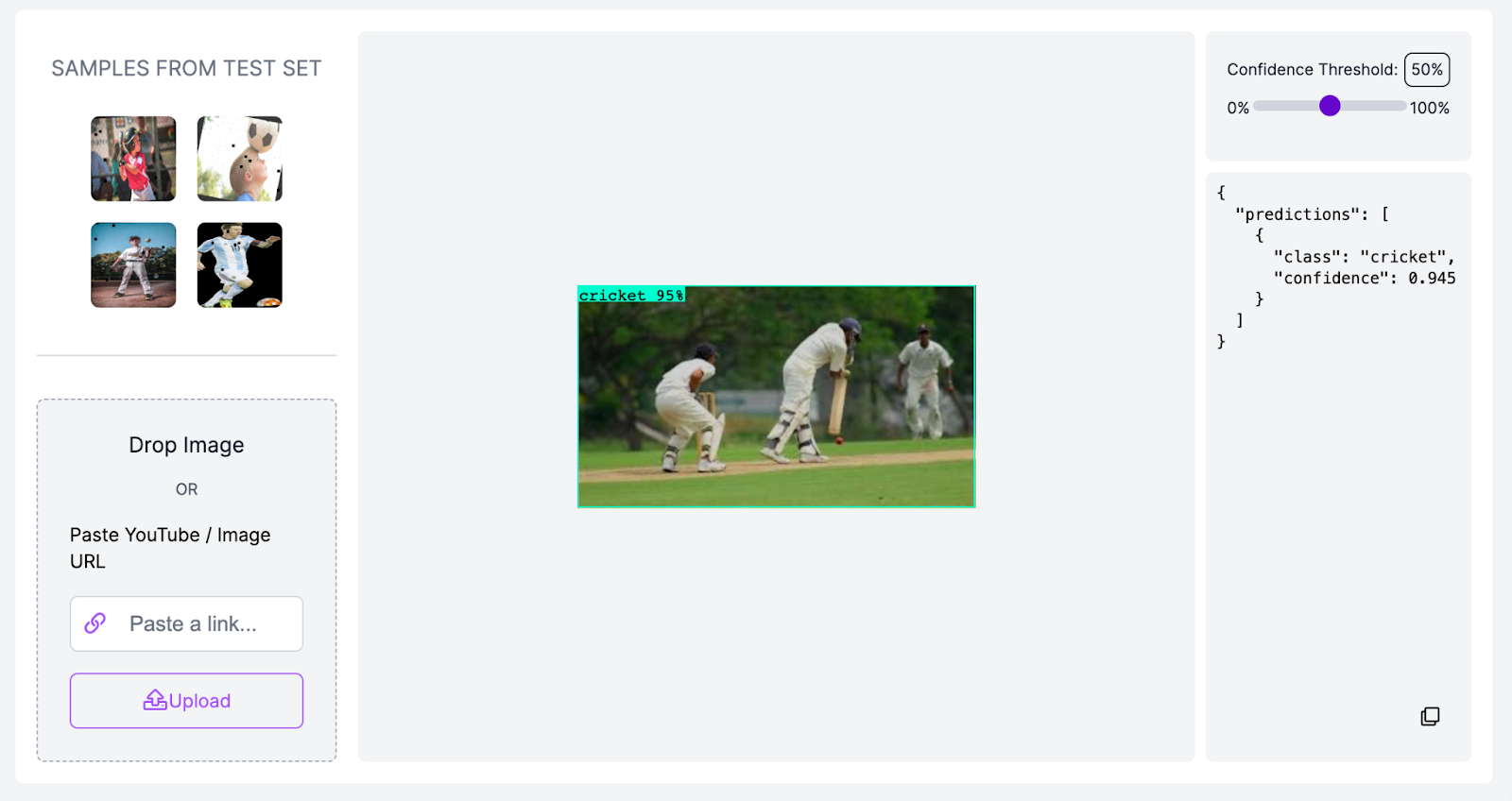 Our image has been given the label “cricket” with a confidence rate of 95%. Our image classification model is working!