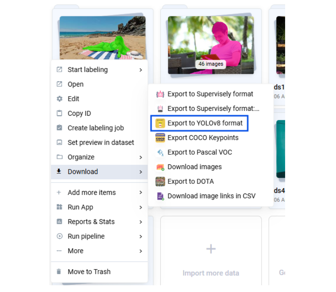 The Supervisely Persons dataset contains images with annotated masks for individual people, making it ideal for instance segmentation tasks. To use this dataset in Roboflow, we need to export it in a format that Roboflow supports, such as YOLOv8, which includes both image files and annotation files (e.g., text files defining bounding boxes and masks). This step ensures compatibility and sets the stage for seamless data import.