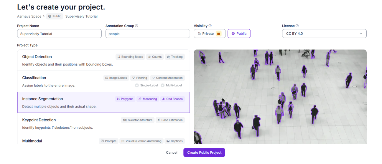 Roboflow is a user-friendly platform that simplifies dataset management, model training, and deployment. Creating a project in Roboflow allows you to organize your dataset, apply preprocessing, and train a model tailored to your use case. For person segmentation, we’ll set up an instance segmentation project to handle the Supervisely dataset.