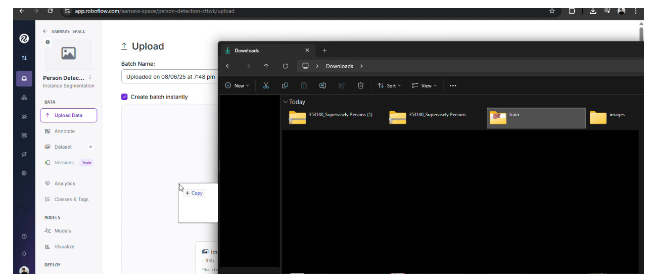 Navigate to the Upload Section: In your Roboflow project, click the “Upload” button on the dataset page or find the dataset folder in your file explorer and drap and drop it onto the upload section: