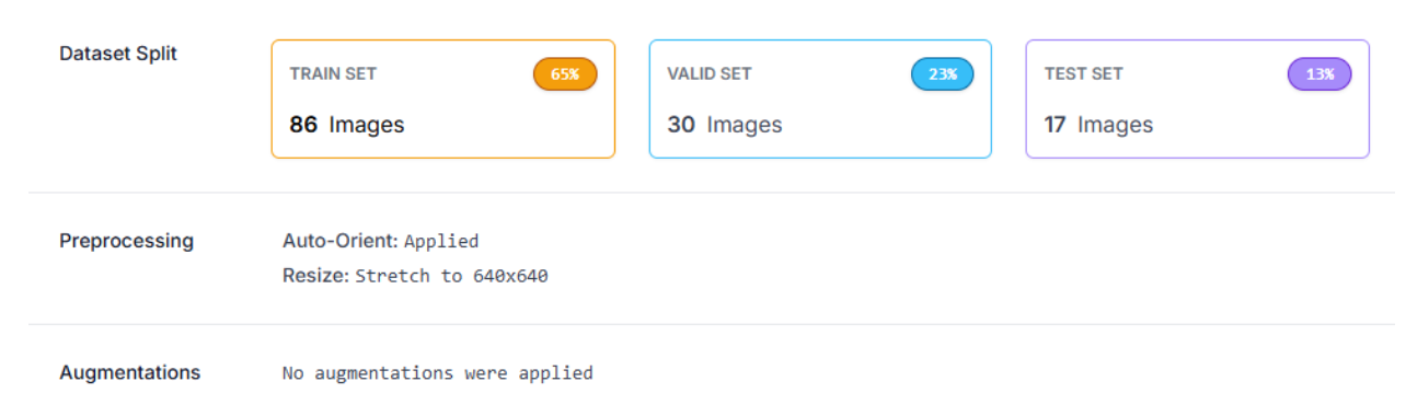 - Resize: Set the image size to 640x640 pixels (stretched). This standardizes the input size for the model, balancing detail and computational efficiency.