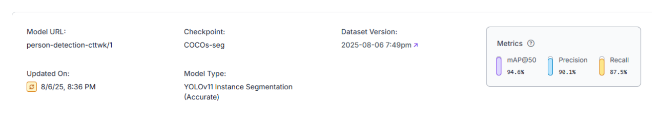 Training a model is where the magic happens! We’ll use Roboflow to train a YOLO11 model, an architecture known for its accuracy in object detection and segmentation tasks. By configuring preprocessing and training parameters, we’ll ensure the model learns to accurately segment people in the dataset.