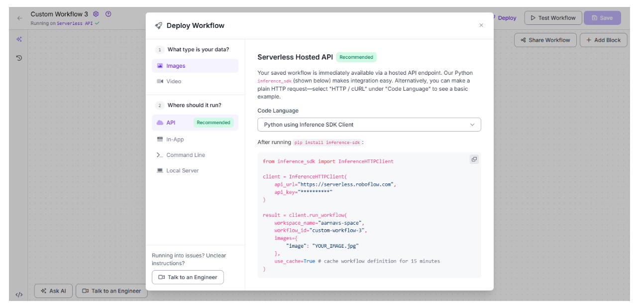 - Serverless Hosted API (Recommended): Host the model on Roboflow’s servers with a hosted API endpoint. Your saved workflow is immediately available via the Python inference-sdk (shown below) or an HTTP/CURL request. This is ideal for quick integration into web or mobile apps.