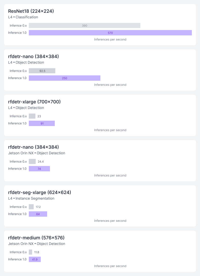 Complete backwards compatibility makes Inference 1.0 a drop-in replacement for previous versions (enabled via the USE_INFERENCE_MODELS flag), allowing for easy testing and painless migration for anyone self-hosting Inference. With newly optimized runtimes, you'll achieve significantly better GPU utilization and higher overall output. This means you can process more inferences with less compute, actively driving down your hardware costs. For access to the optimized and pre-compiled TensorRT weights, connect with our Sales team.