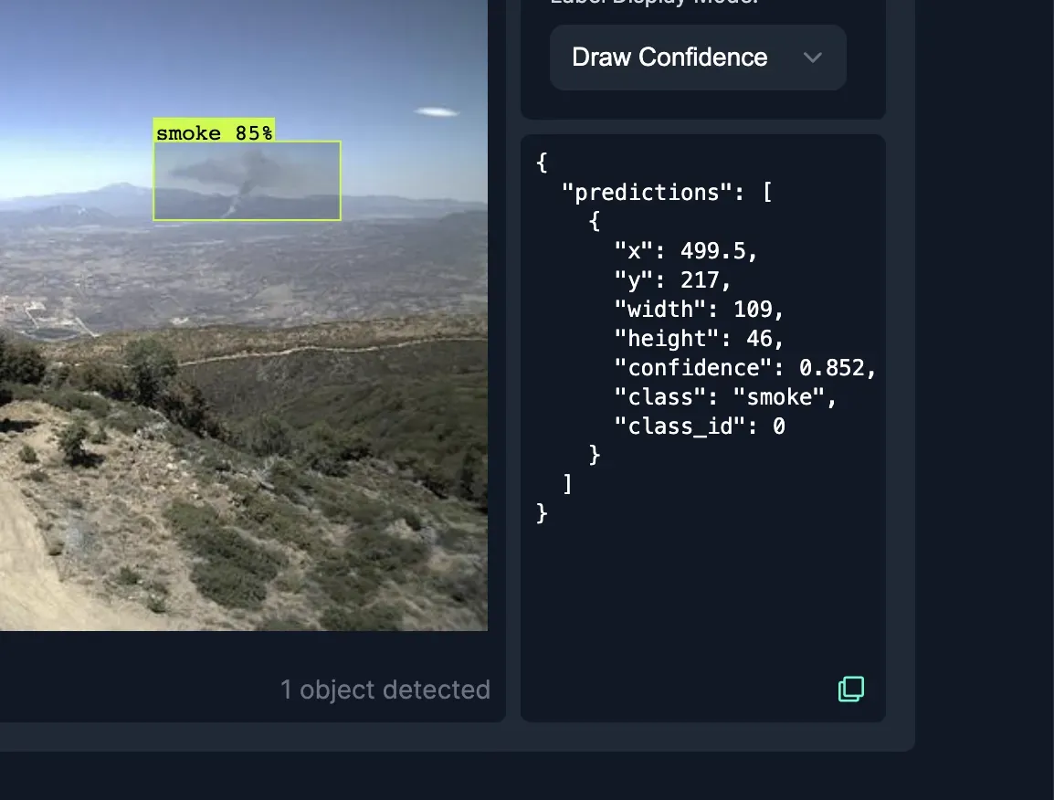 --project-id wildfire-smoke --model-version 1 --host https://detect.roboflow.comThe results should now look exactly the same as the ones on Roboflow Universe, as inference is being run on the same version and hardware on our remote servers.