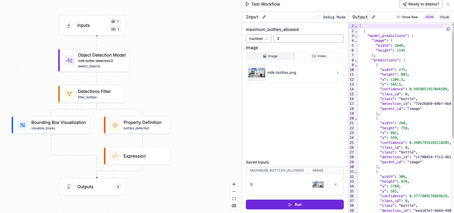 Workflows are multi-stage computer vision applications built around a model. You can build Workflows in a web interface using your model weights, then get the code you need to run the Workflow on your hardware.