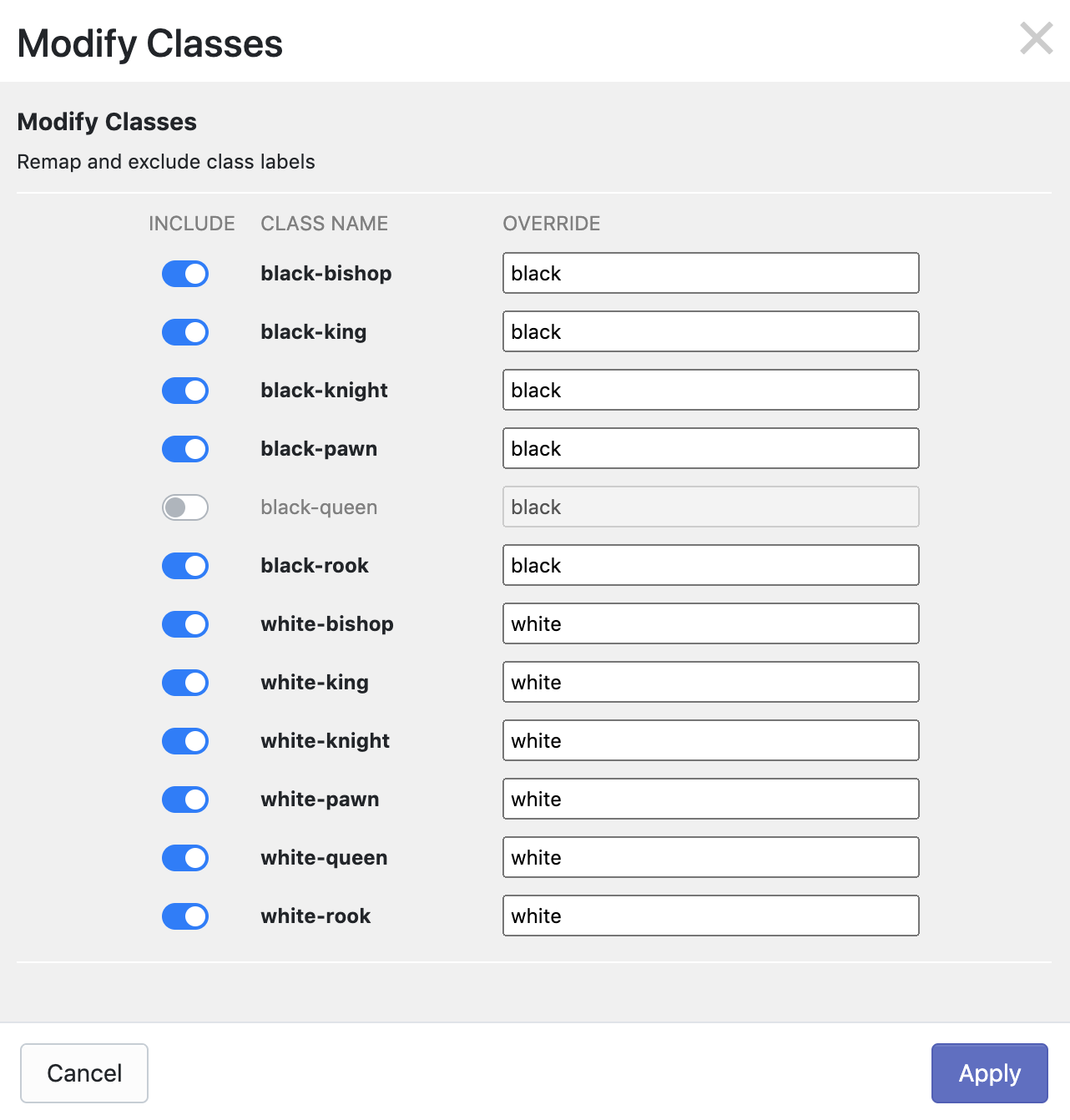 Hit Apply to save. Now, when you finish your other preprocessing and augmentation settings and click Generate the dataset version will export with these new class label settings.