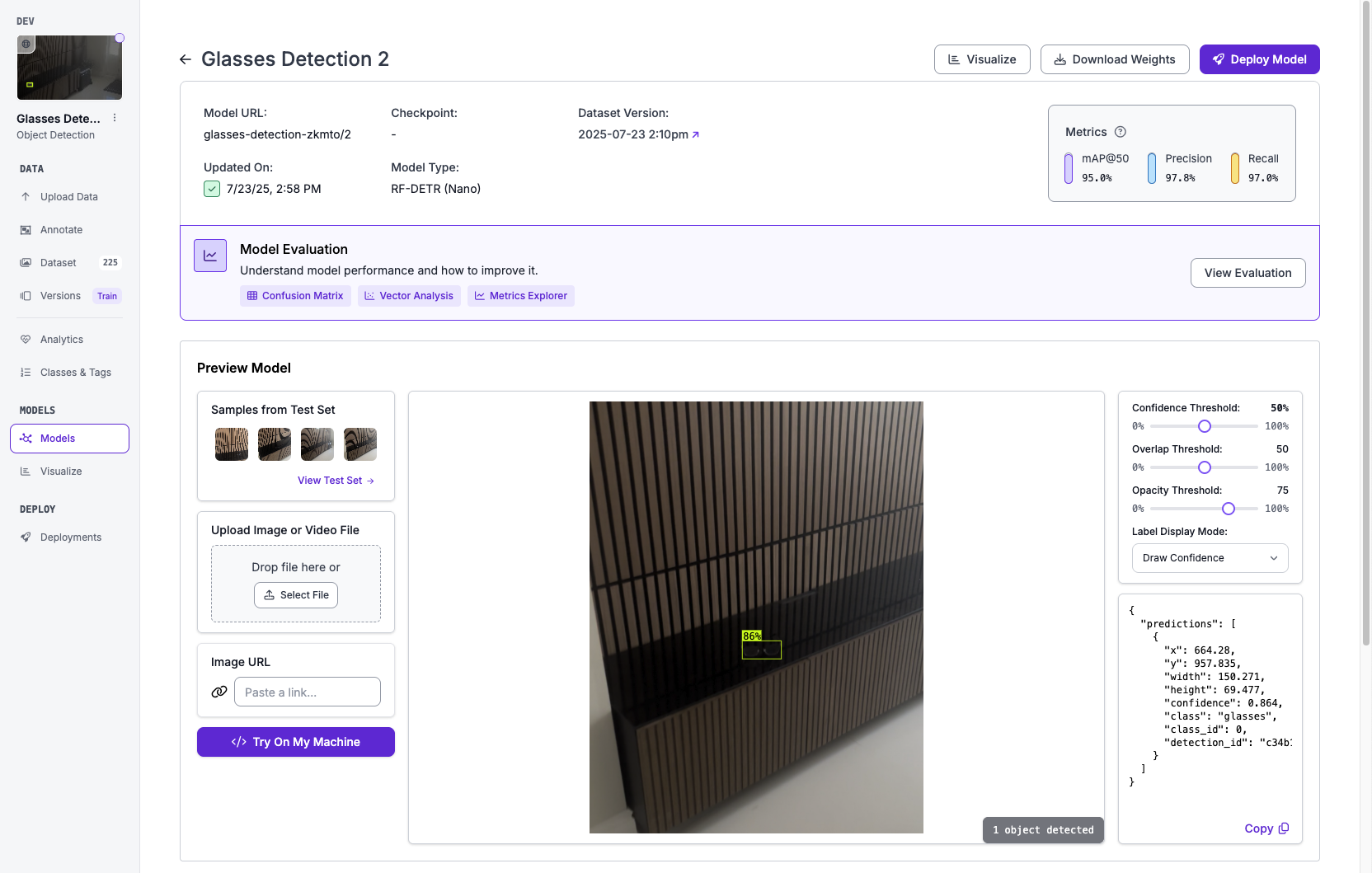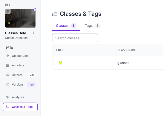 To start, we'll need a model that is able to detect glasses from a given frame. You can do this easily with Roboflow. For this, I suggest following this guide describing how to train an RF-DETR object detection model. The sample data you decide to train on should be images/videos of a room with glasses somewhere in it.