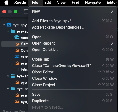 In the same directory as ContentView, add another file called CameraOverlayView.swift. This page will show us a live camera preview that will be opened when we click the "Find My Glasses" button from the home page: