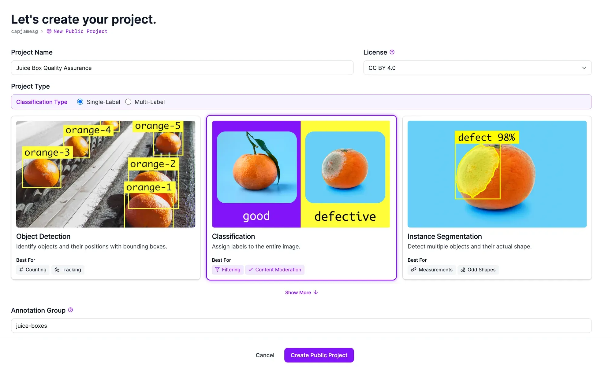 When asked to choose a project type, select Classification. This is because we are going to classify whether a juice box does or does not have a defect present. We don't need to know where the defect is, the specialty of object detection and segmentation models. Learn more about image classification in our comprehensive guide.