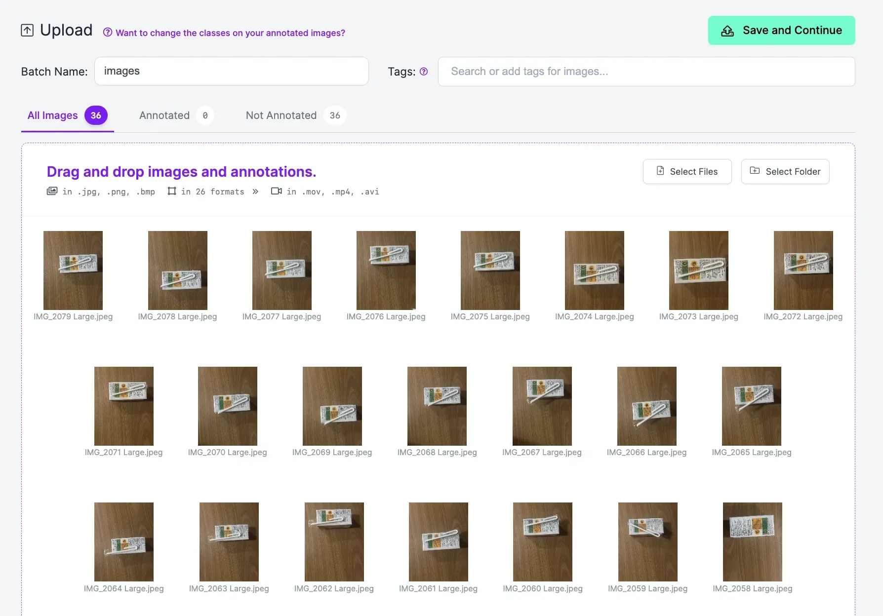 When you upload your images, they will be processed. Then, a button will appear that says “Save and Continue”. Click this button to upload your images to Roboflow.