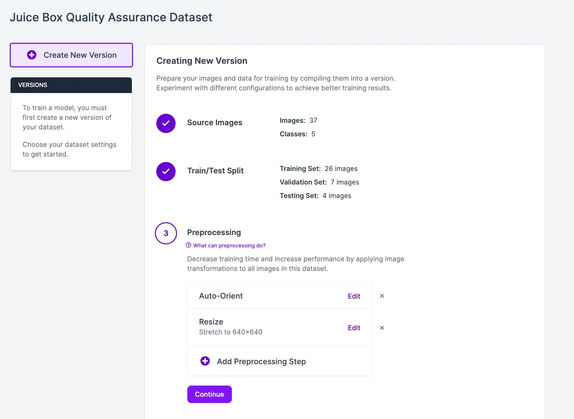 Once you have labeled your data, you can generate a dataset version. A dataset version is a snapshot of your dataset that you can use to train your juice box quality model.