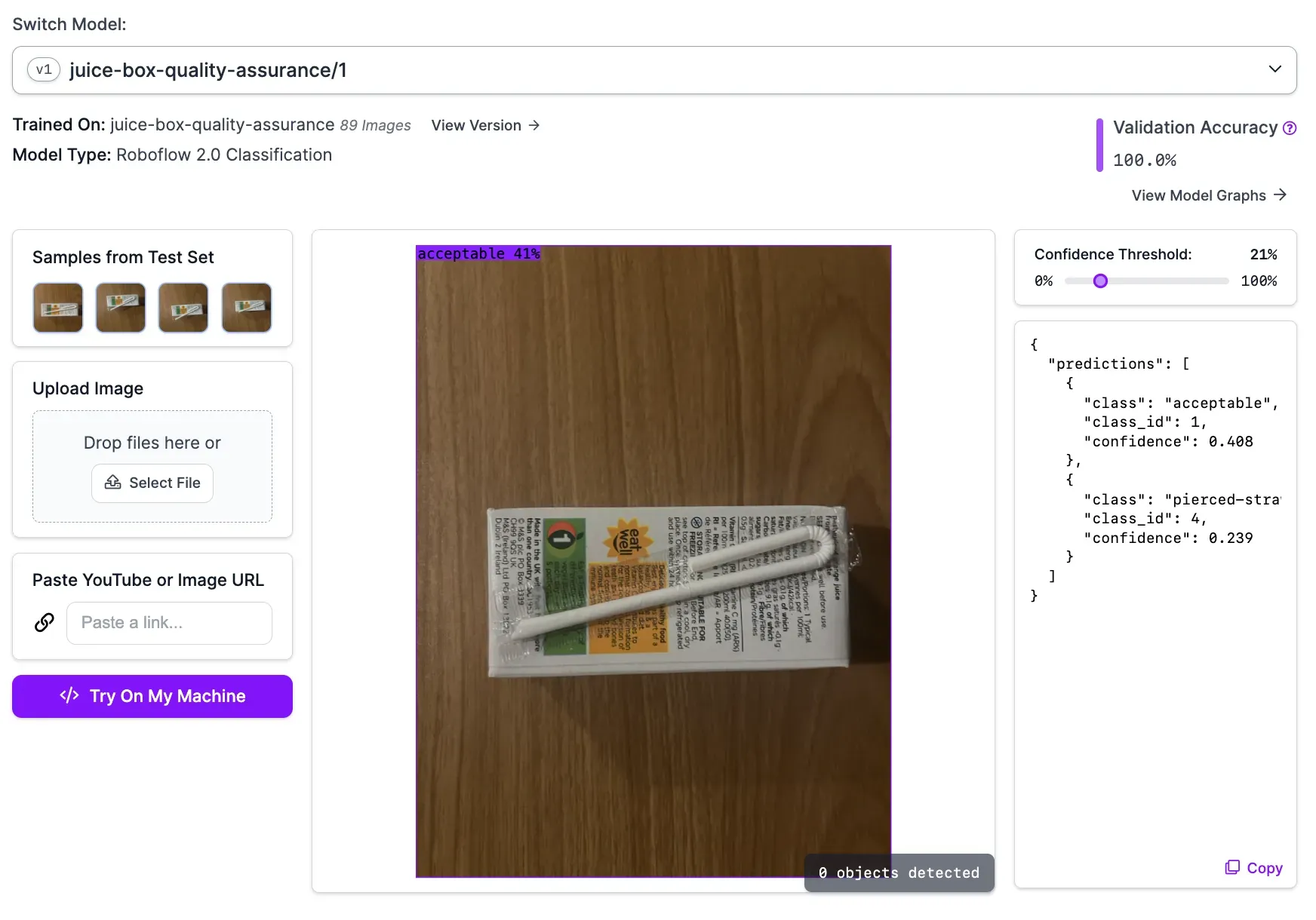 print(results[0].predictions[0].class_name)Above, replace juice-box-inspection/1 with the model ID associated with your Roboflow project. Learn how to retrieve your model ID.