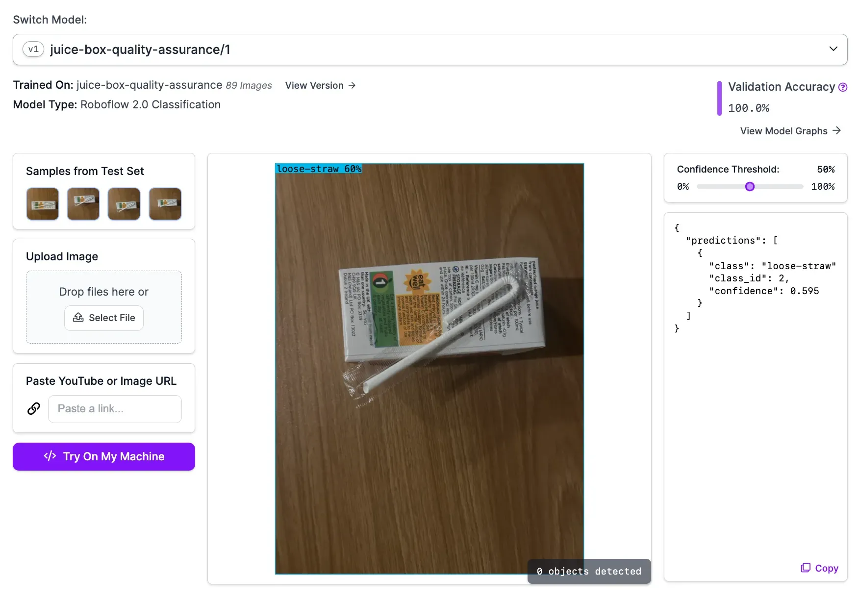 You can build a juice box quality inspection system with computer vision. In this guide, we walked through how to build a classification system that identifies whether a box has a straw, is missing a straw, or has a defective straw.