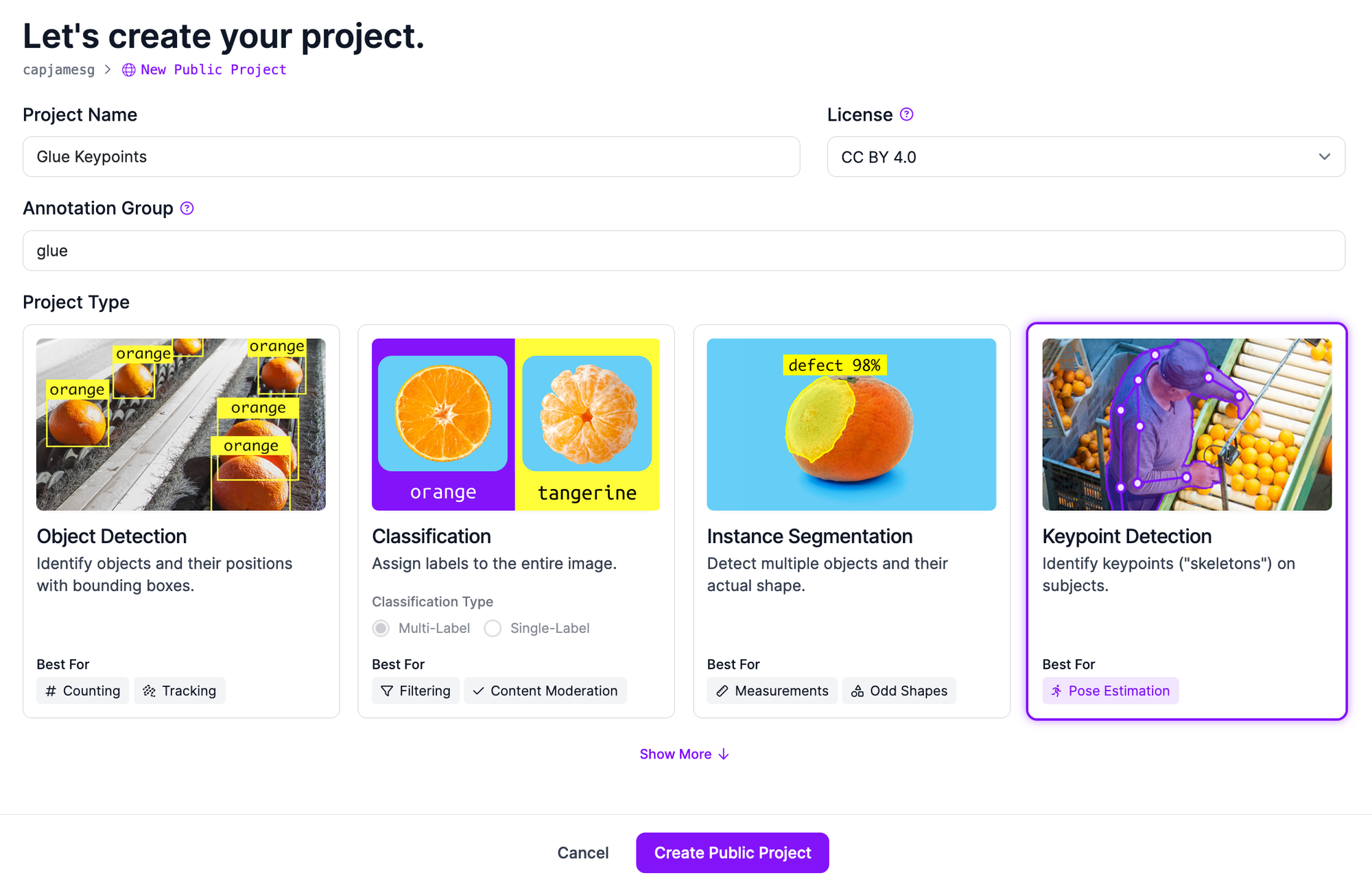 On the Project creation page, set a name for your Project, then choose the “Keypoint Detection” project type. Click the “Create Project” button to create your project.