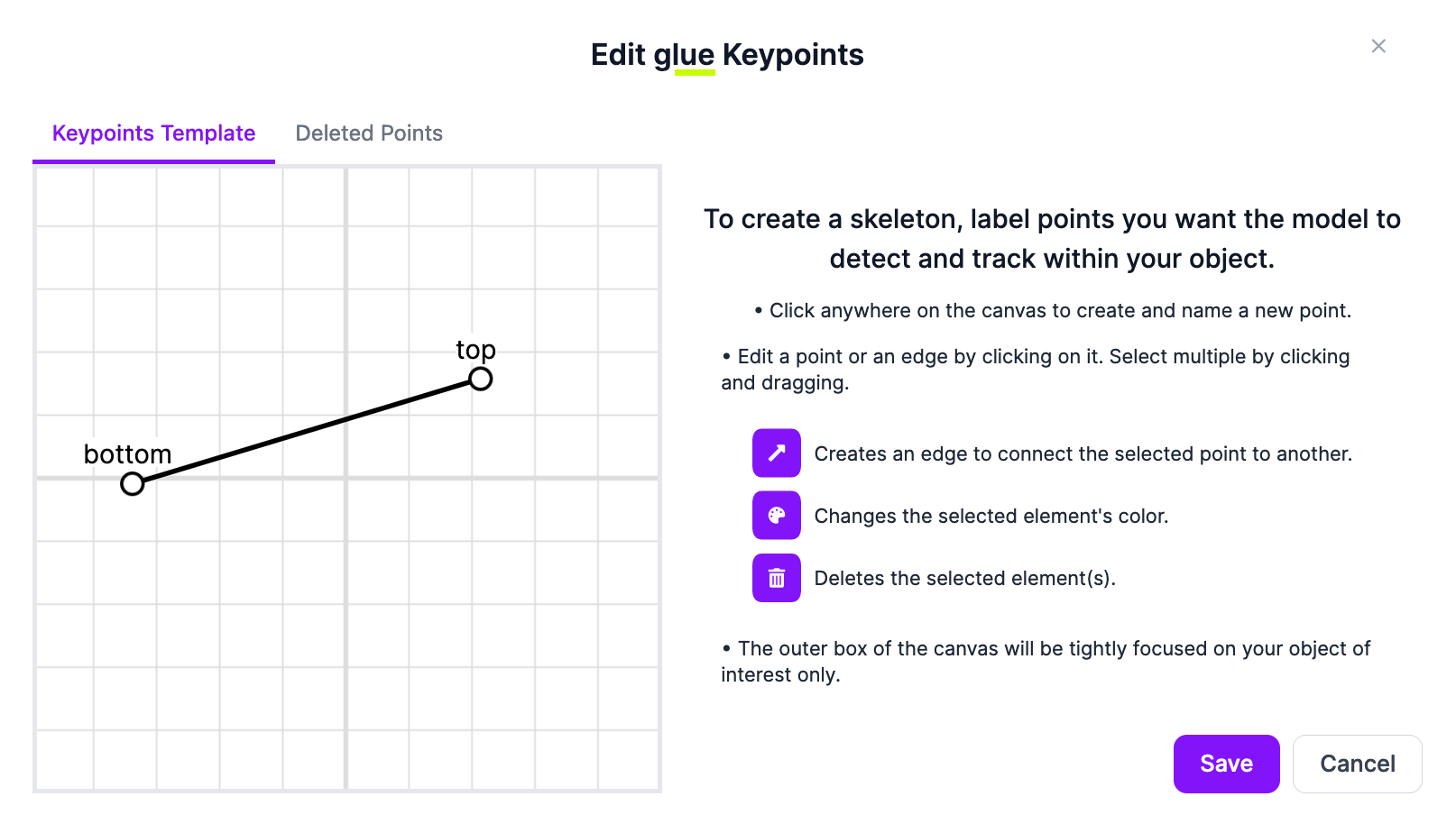 To create a keypoint, click on the grid and give the point a name. You can add as many keypoints as you want. When you have configured a keypoint class, click "Save" to save the class.