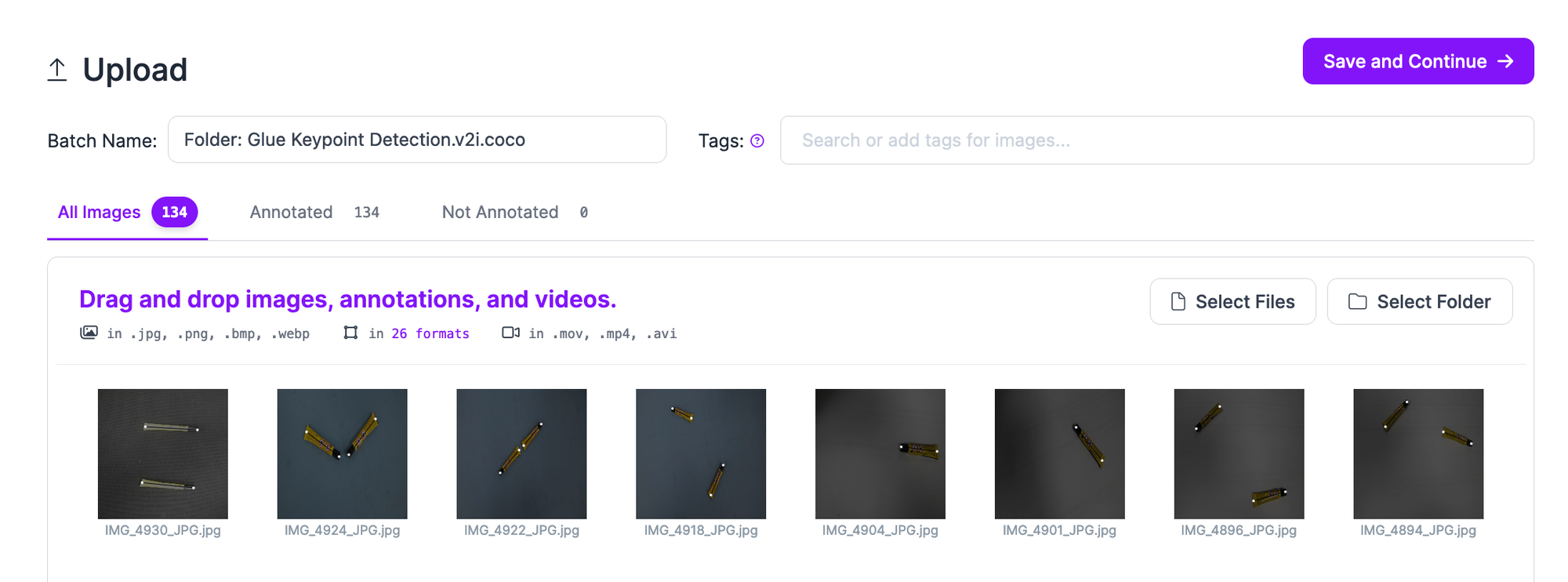 Your images will first be processed in the browser. Then, a “Save and Continue” button will appear. When you click this button, your images (and annotations if you uploaded any) will be uploaded. The amount of time the upload process takes will depend on the number of images you want to upload as well as the strength of your internet connection.