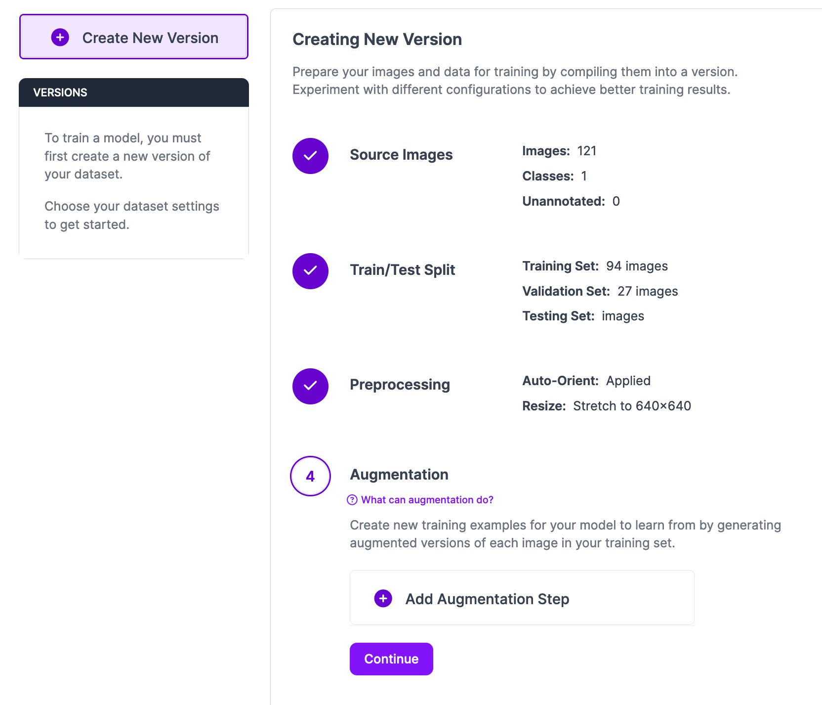 Once you have annotated data for use in training your model, you can generate a dataset version. A dataset version is a snapshot of your dataset that is frozen in time. You can generate augmented images for inclusion in a dataset version.