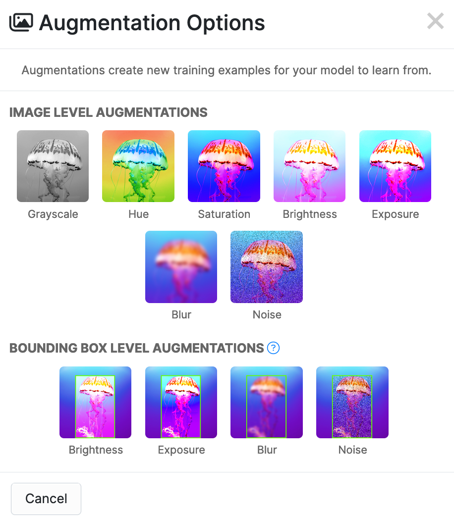 Scroll down to the Augmentations section, then click the “Add New Augmentation” button. A window will appear with options for two types of augmentations you can use: image-level and bounding box-level.