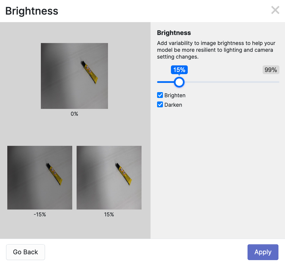 For example, if you choose a brightness augmentation, you can configure the range within which new augmented images will be made brighter, darker, or both.