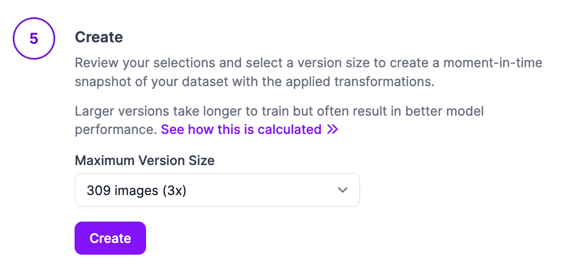 Once you have configured your dataset version, scroll down to the bottom of the page and click “Create”. The Maximum Version Size refers to how many images will be in your dataset after augmented images are generated and added. We recommend setting this value at 2x or 3x.