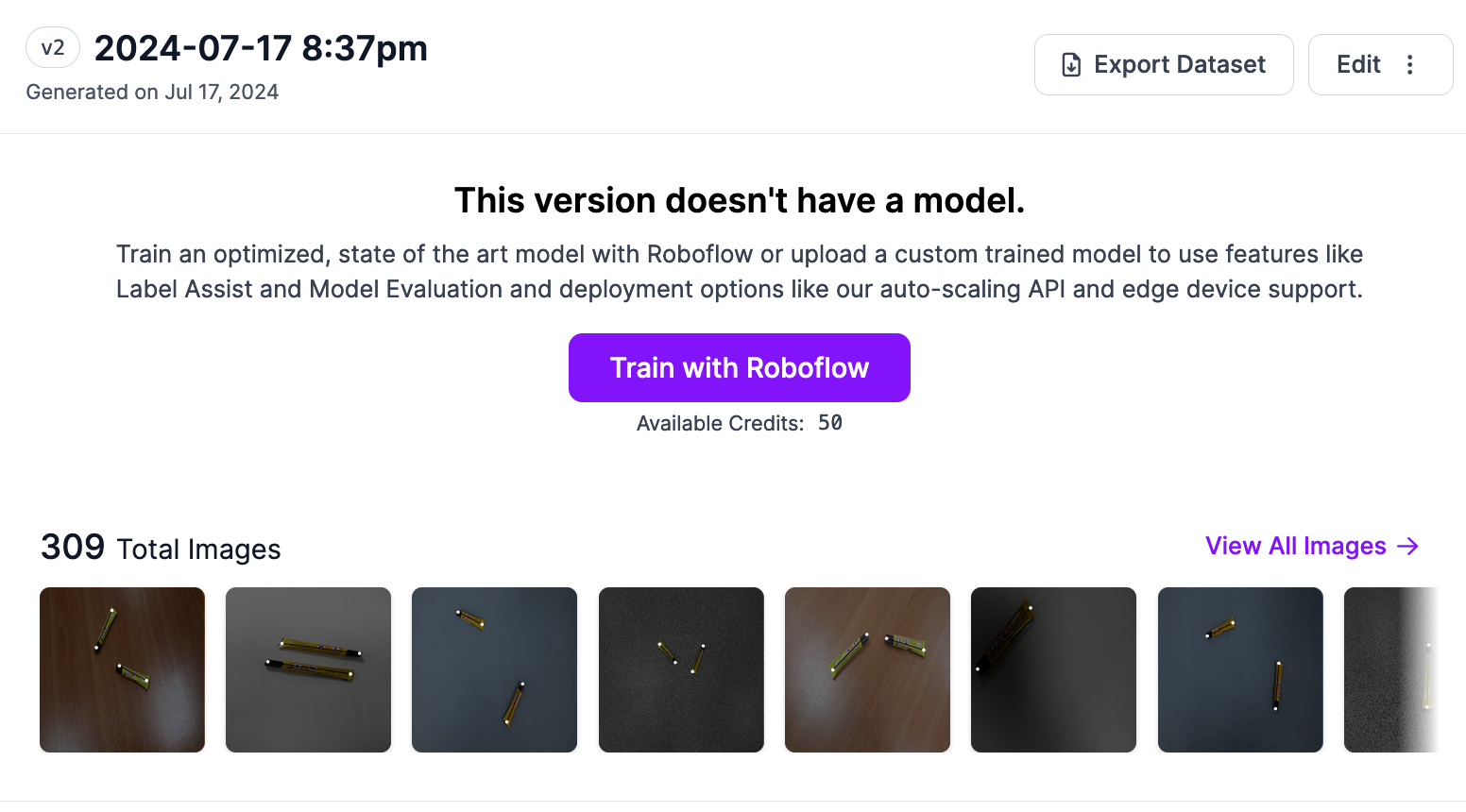 To train a model in the Roboflow platform, click the “Train with Roboflow” button and configure your training job. To export your dataset, click the “Export Dataset” button. You can export your dataset into the COCO Keypoints format.