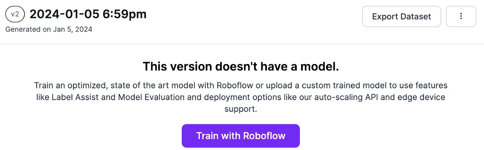 When your dataset has been generated, you will be taken to your dataset version page. From this page, you can train a keypoint detection model using your dataset.