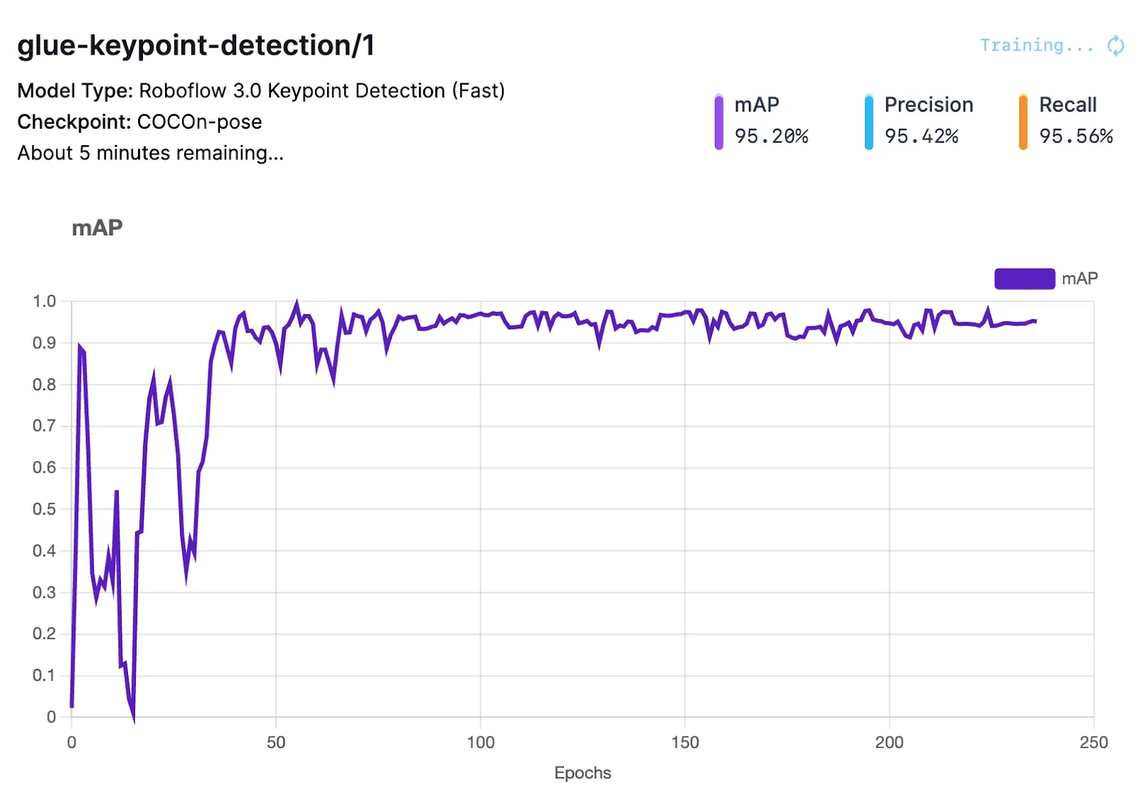 In this guide, we demonstrated how to train a keypoint detection model on Roboflow. We walked through how to upload and annotate data. We then discussed how to generate a dataset version with preprocessing applied to help prepare your dataset and augmentation steps to boost model performance. We then trained a model and tested the model in a browser.