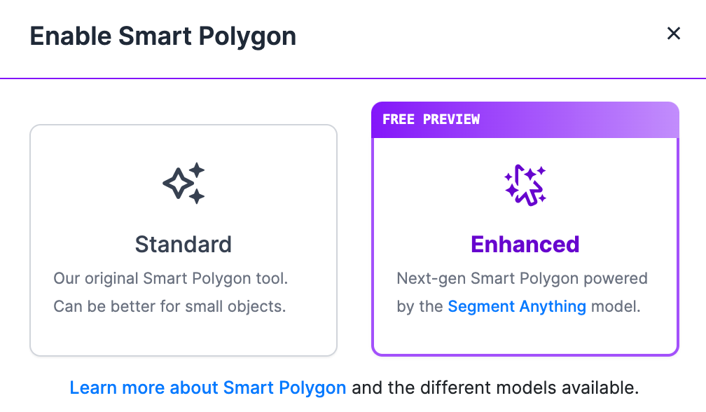 Once you’re in the labeling interface, click the cursor icon in the right toolbar to enable Smart Polygon and select the free preview of Enhanced.